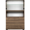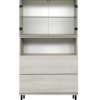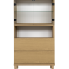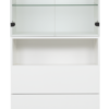 Ylhäällä yksi lasihylly, keskellä avohylly ja alhaalla kaksi ponnahtavaa laatikkoa.