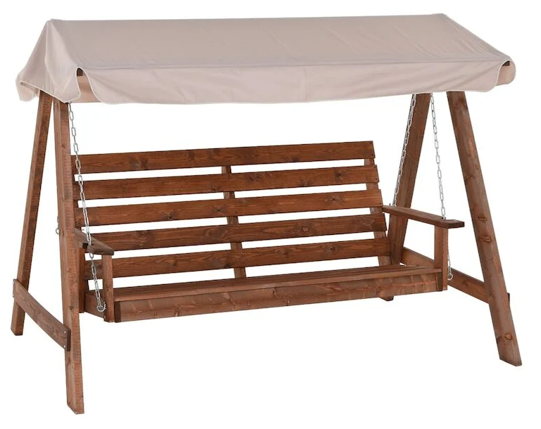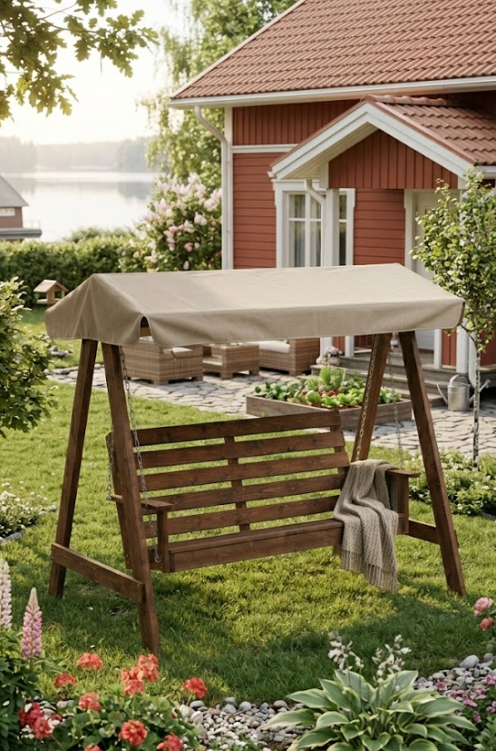 Tyylikäs kokonaisuus: Puuosat on sävytetty tyylikkään ruskeaksi vesiohenteisella kuullotteella, joka suojaa puuta ja korostaa sen luonnollista kauneutta. Ruskea puurunko yhdistettynä raikkaaseen beigeen katokseen luo ajattoman ilmeen, joka sopii jokaiselle pihalle ja puutarhaan.
