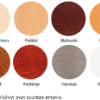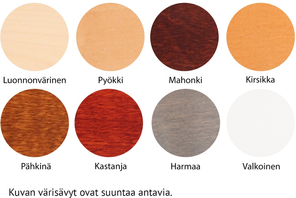 Värit: maalattu valkoinen, koivuluonnonväri, sekä petsivärit: pähkinä, ruskea (mahonki), kirsikka, pyökki, harmaa.